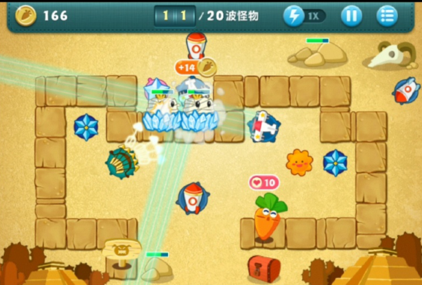 4. 这套阵容的实力还算不错。接下来的目标就是击败怪物来积累金币,之后再给炮塔进行升级。记得把太阳右侧的石头道具清理掉,这样就能得到一个雪花道具。雪花的作用是将怪物冰冻在原地,和减速类道具的效果类似,建议尽量把它放在攻击力较高的炮塔附近。