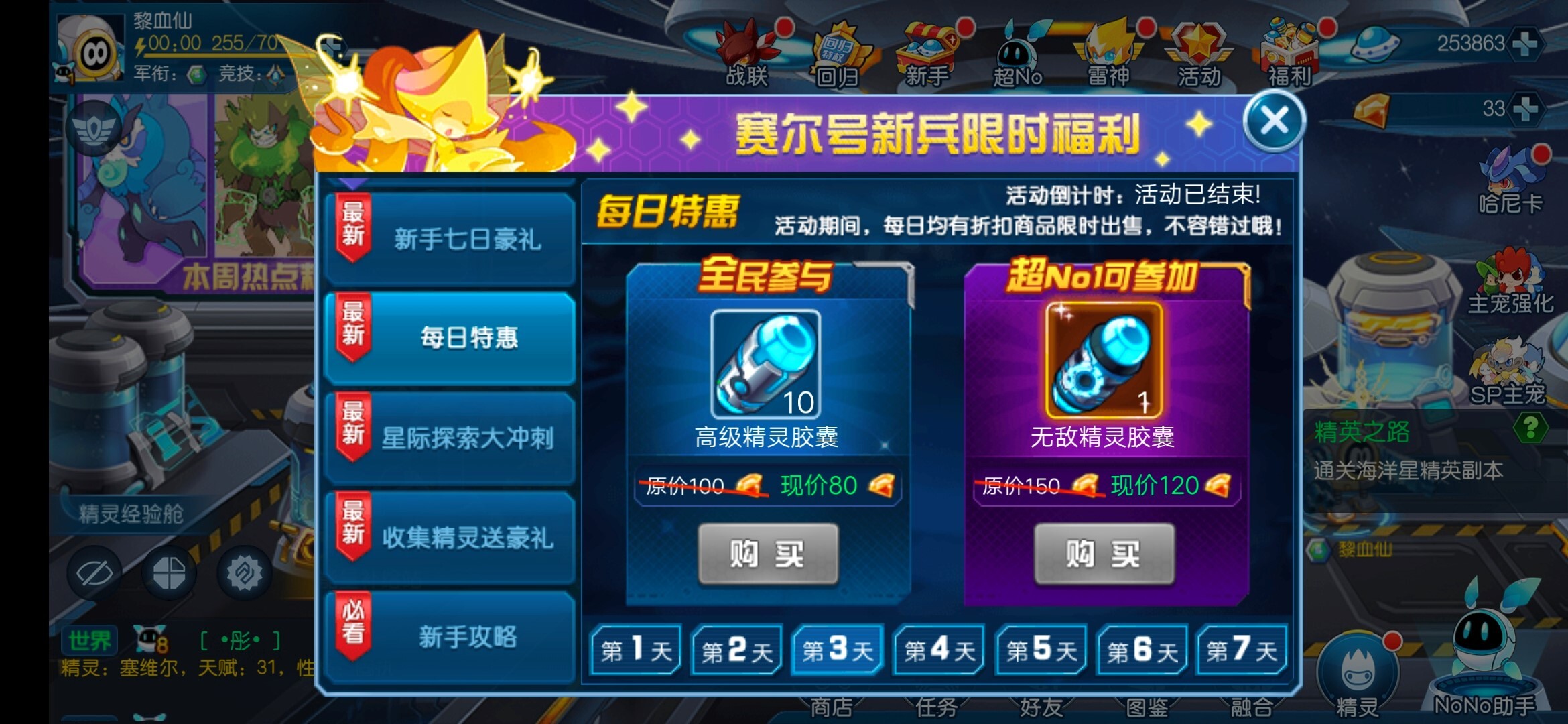 4. 这是新版赛尔号为新兵准备的限时福利,在登录第三天,玩家可以用80钻石和120钻石的优惠价格,分别购买到高级精灵胶囊与无敌精灵胶囊。