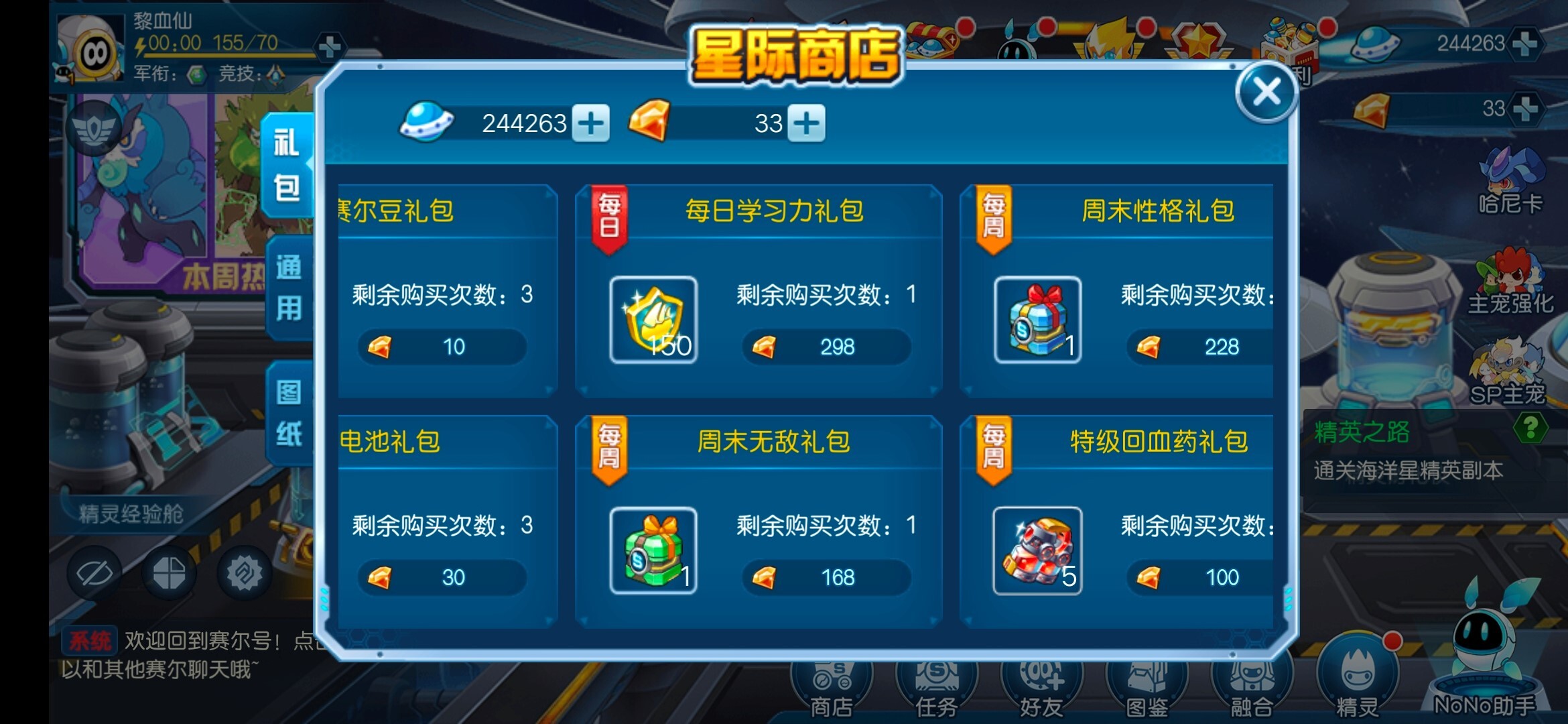 2. 第二个购买精灵胶囊的渠道同样来自星际商店,具体是在商店内的礼包板块。该板块中售价168钻石的周末无敌礼包,有机会开出极为稀有的无敌精灵胶囊。