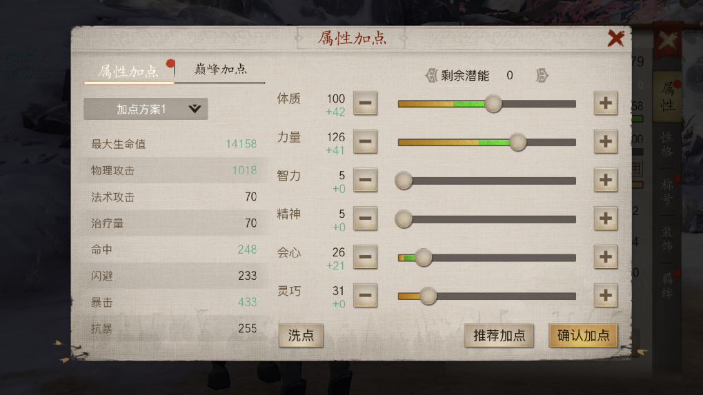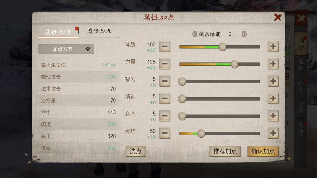 这种加点方案挺特别的,带有明确的针对性——灵巧属性能带来不错的闪避提升,4点力量搭配1点灵巧的组合,既能保证输出能力,又能增强对抗物理输出时的闪避效果,非常适合刺客以及物理输出职业在PVP场景中使用。不过这套加点对装备的要求不低,至少得有一把优质的武器才行。