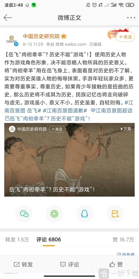 要知道如今玩家的素质可是日益提升。就以《江南百景图》的事情为例,在这之前,就连小编本人都不清楚“肉袒牵羊”是什么意思。然而岳飞相关的内容一出来,官方微博评论区瞬间骂声如潮。这充分表明,玩家具备自己的辨别能力,对于任何侮辱历史人物的行径,没有一个玩家会选择坐视不管。