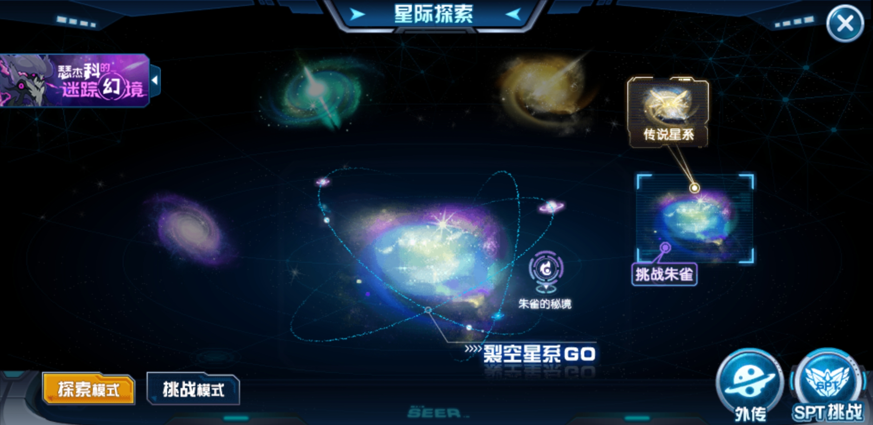 朱雀是裂空星系的神兽,玩家需达成三个必要条件才能开启其挑战;裂空星系内还存在传说星系,玩家可在此挑战神圣谱尼,但同样需要满足挑战谱尼的必备条件。