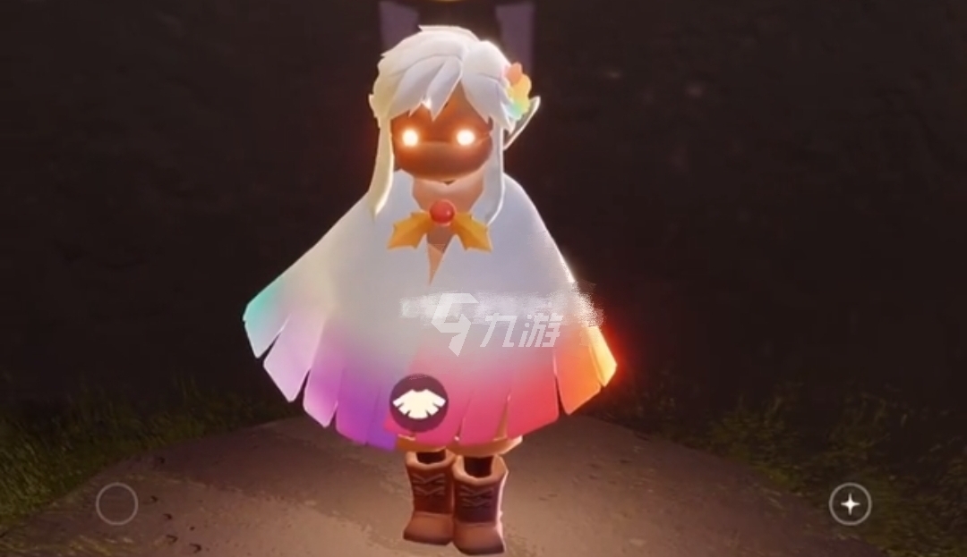 现在我用的是单色尾迹魔法,而彩虹尾迹魔法会呈现出彩色效果,使用后尾迹会变得五彩斑斓,跟着彩虹的色彩不断变化。不过彩虹尾迹魔法的颜色无法叠加,要是你拉着小伙伴一起用不同的彩虹尾迹魔法,你们就能组成彩虹小分队啦(温馨提示:彩虹尾迹魔法在禁阁地图里会更显眼哦)。解锁前置节点后会获得彩虹斗篷,需要175根白蜡烛才能解锁,它的配色是上半部分天青色、下半部分彩虹色,背后还有彩虹图标。商店里另外有一顶彩虹帽子,售价68元。接下来就是我的上身效果图啦。