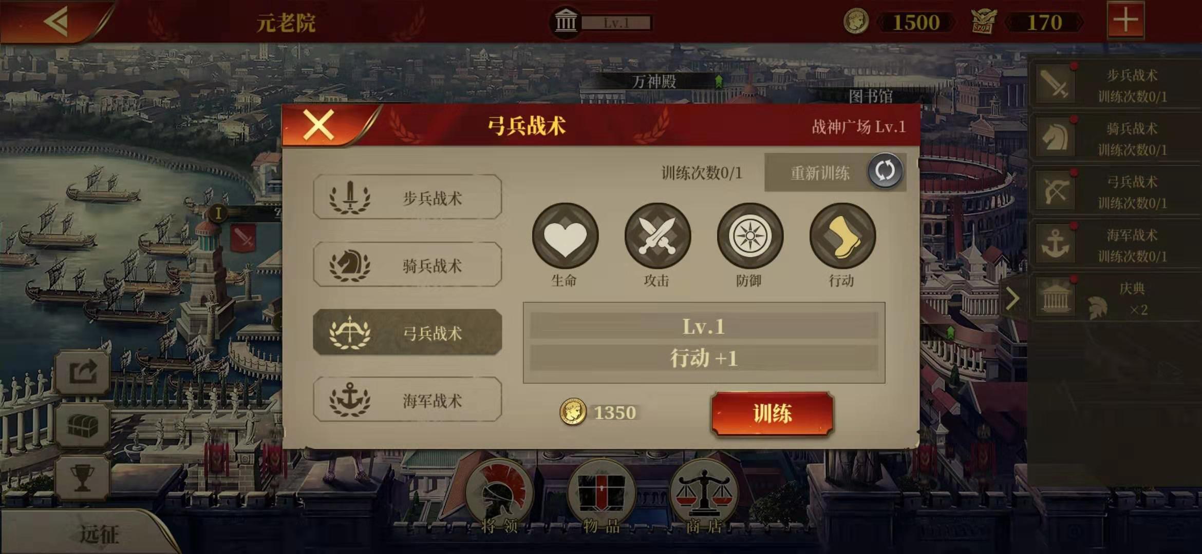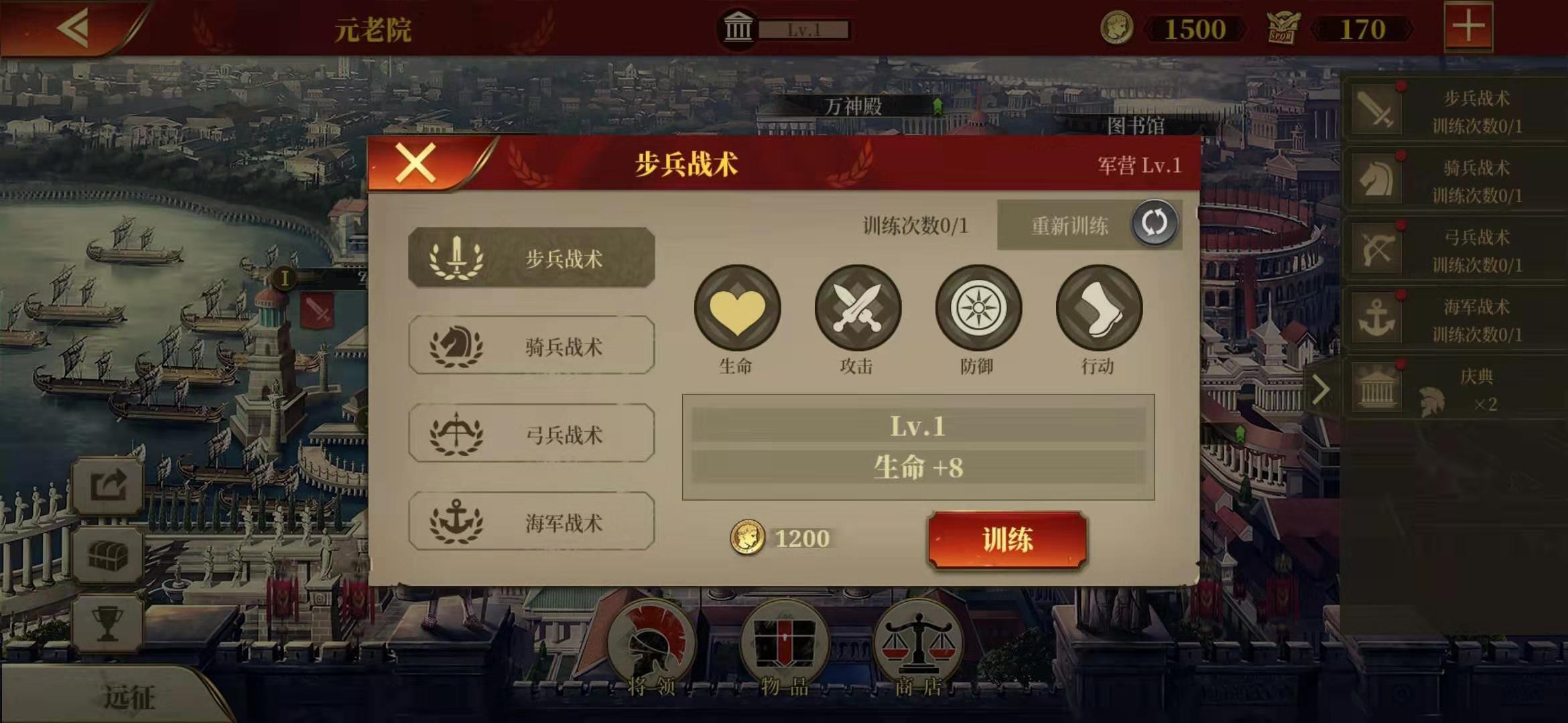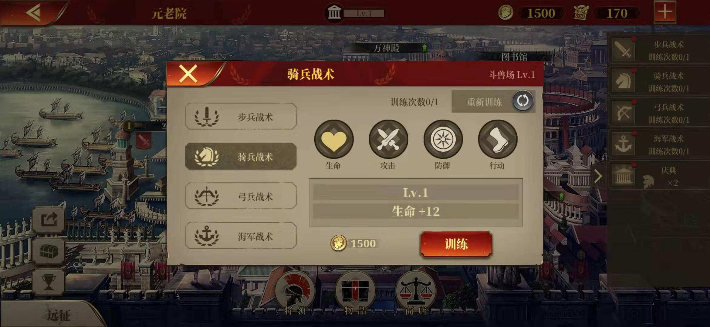4.玩家可通过升级军营、斗兽场、战神广场和军港获取训练次数,战术等级越高,所需的训练次数就越多。