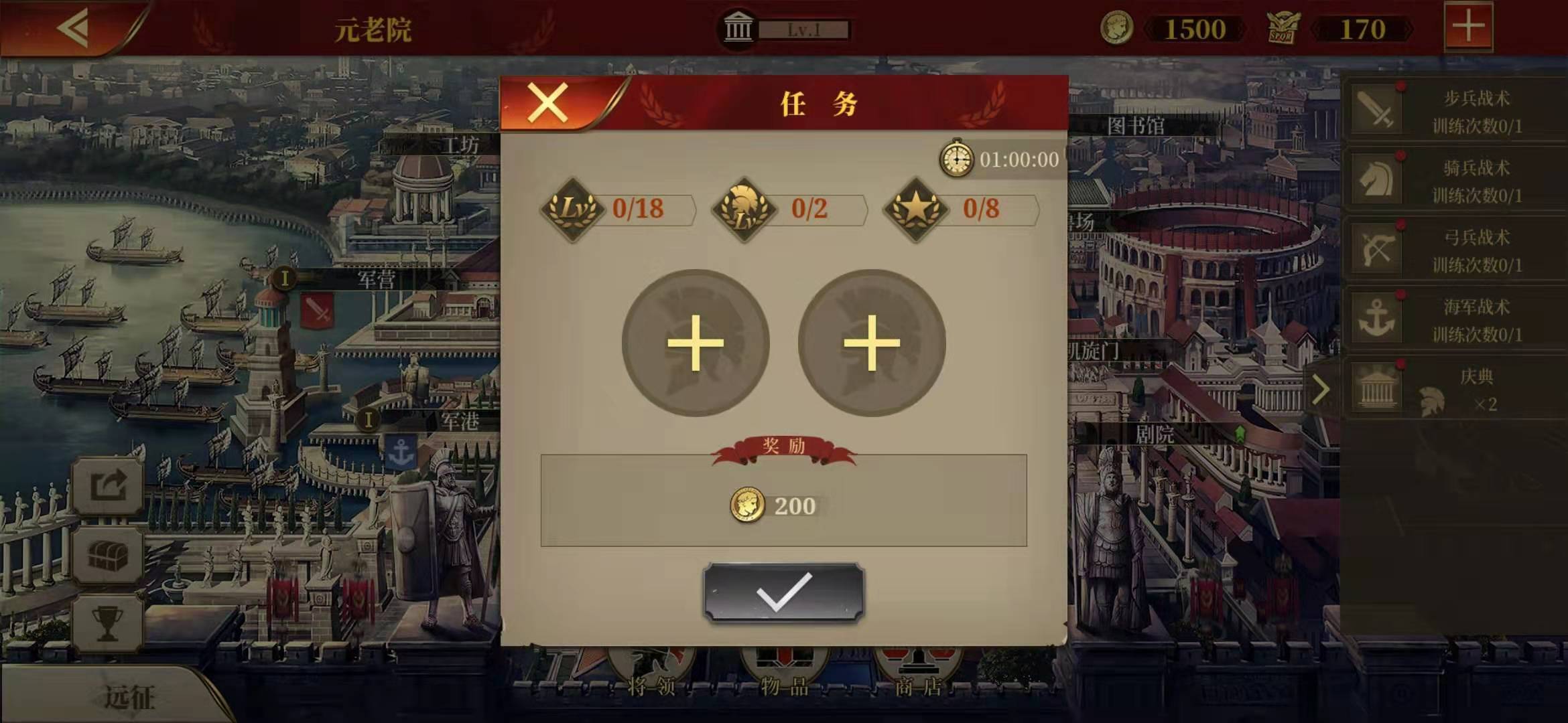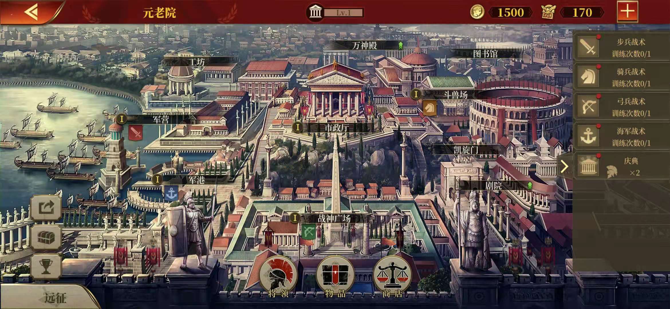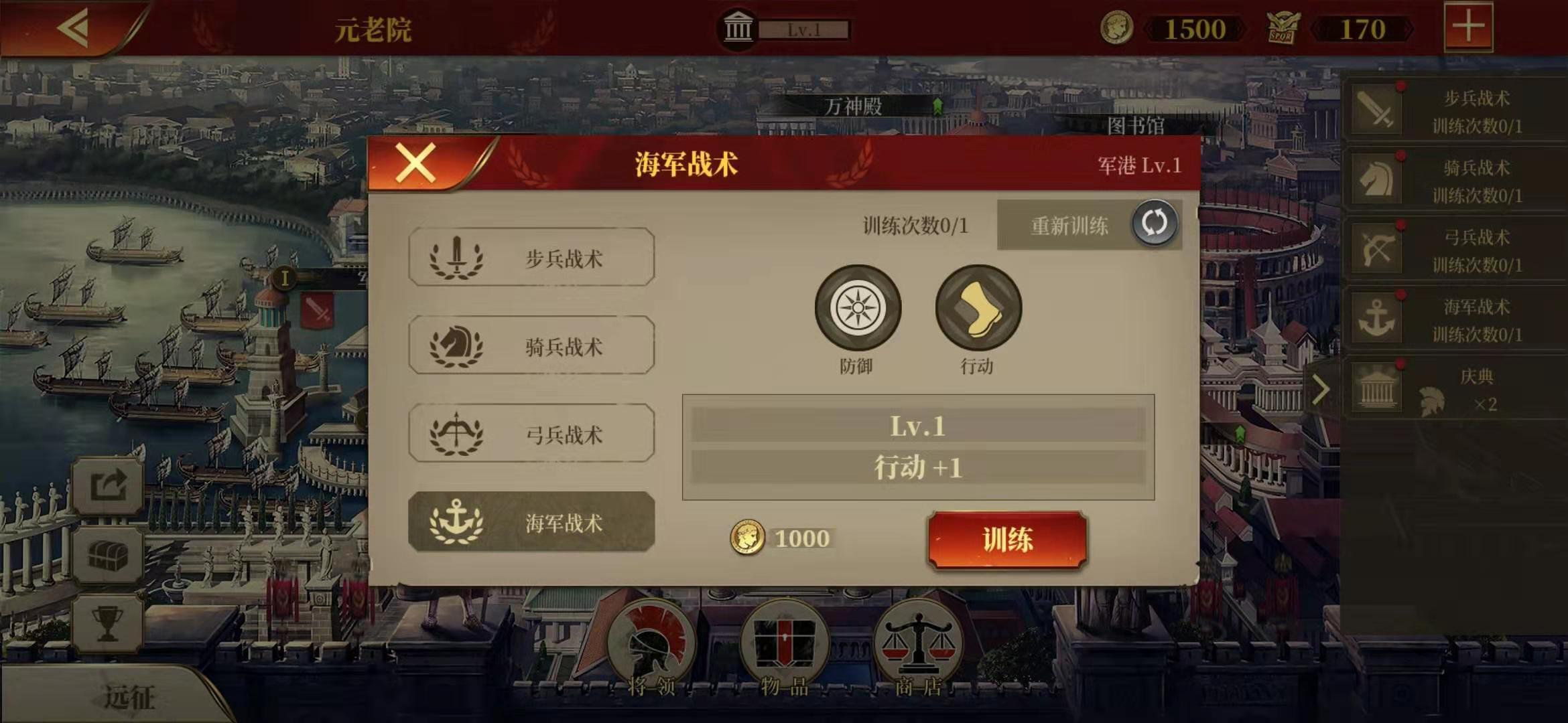 4.玩家可通过升级军营、斗兽场、战神广场和军港获取训练次数,战术等级越高,所需的训练次数就越多。