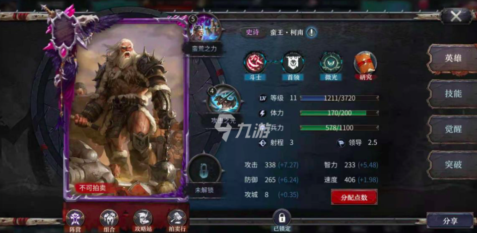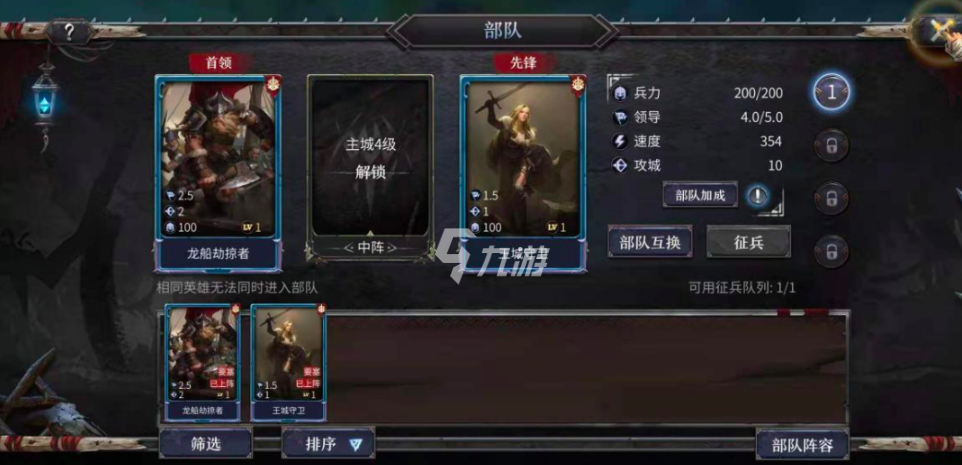 主线推进到第三章结束后,蛮王挑战就会解锁,完成战斗可获取紫色品质英雄蛮王柯南。他是前期开荒的核心战力,攻城表现也十分出色。把柯南和之前赠送的王城守卫、龙船劫掠者组合起来,就能形成一套实用的开荒阵容。