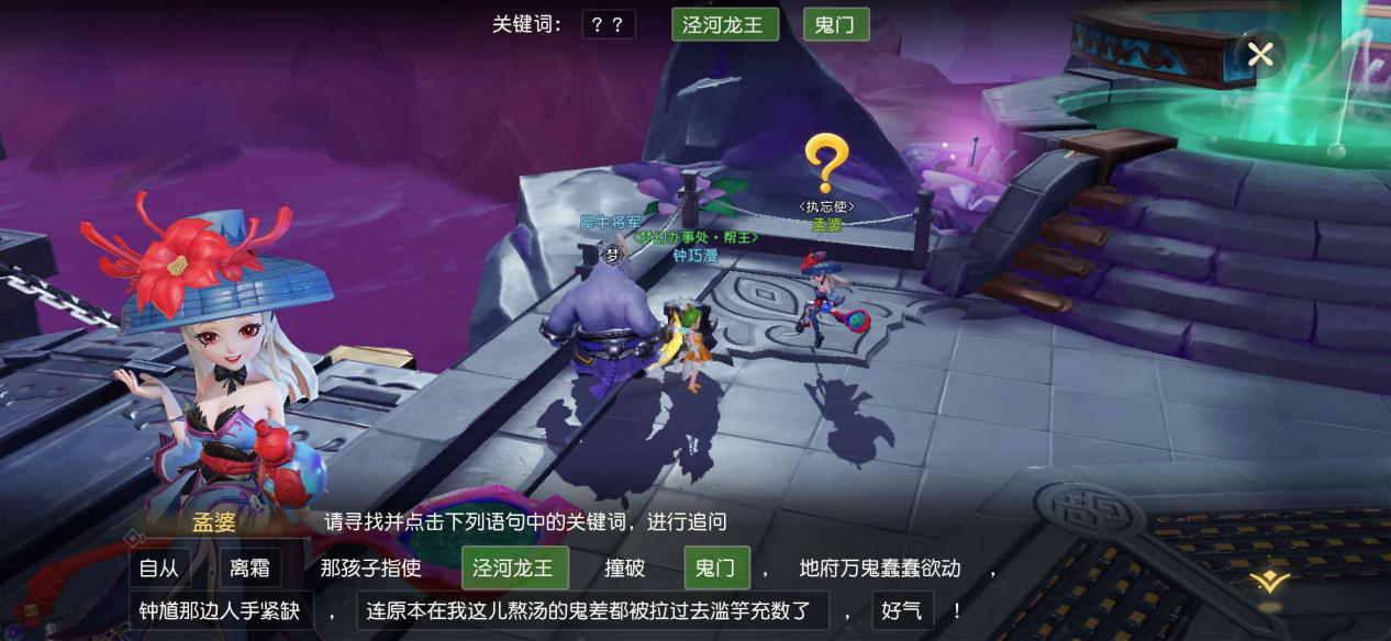 第三步,在给其他鬼魂喝下孟婆汤后,选择“泾河龙王”“鬼门”“离霜”这三个关键词进行对话,之后去找崔判官,再向阎王禀明情况。这里的对话选择需要谨慎,正确顺序是“判官确实去修复了”“刚刚发现”“忙于度化长安亡魂”,务必不要选错,否则会引发严重后果。