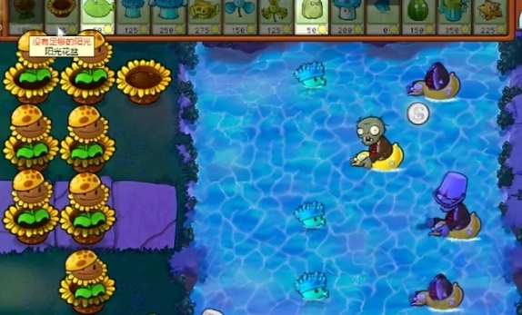 3、于水池区域种下三株寒冰海兵菇,在左边添加向日葵。