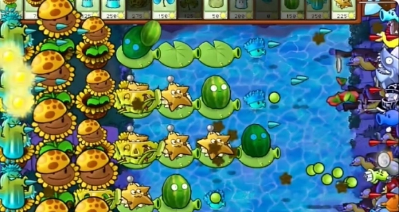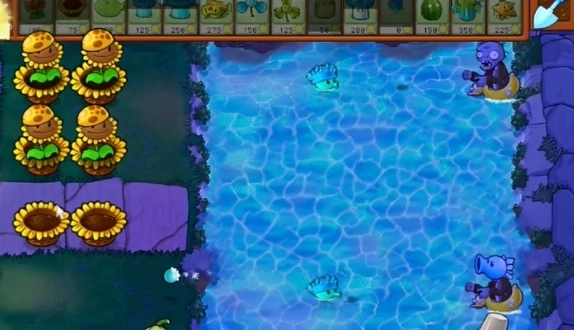 5、接着在左侧增添向日葵花盆与阳光向日葵,于水池里添加寒冰海兵菇。