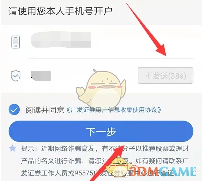 3、接着点击“马上开户”,于新出现的页面中输入手机号,获取验证码后,再点击“下一步”。