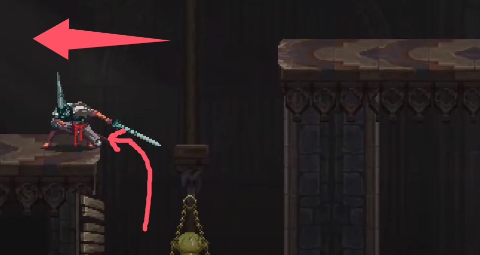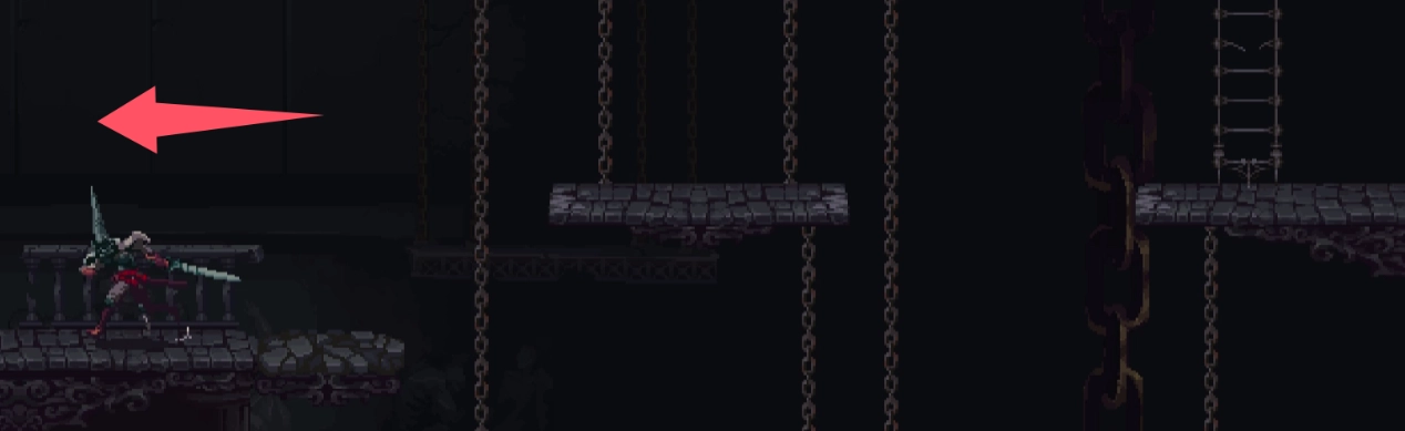 ①离开入口房间继续往上爬。在T字路口中间的平台上使用祈姊篇,把小天使劈下来。