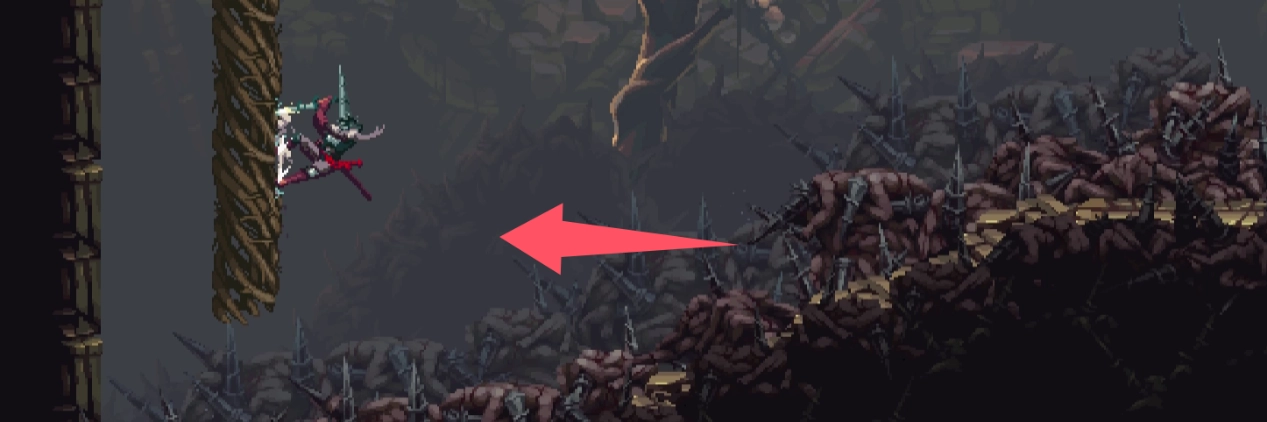 ②从蚀铁之冠的平台上跳下来,回到出生点,然后往左走。装备三结秘舌走到尽头,会有树藤伸下来。沿着树藤爬上去。