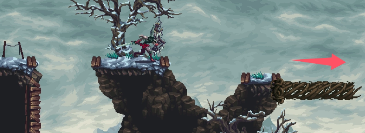 进门后在悬崖这里等一下,会有树藤伸过来。沿着树藤继续向右。