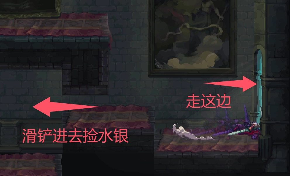 上来后会看到水银。不过要绕房间一圈,在右边滑铲进入摆锤区域,才能捡到它。