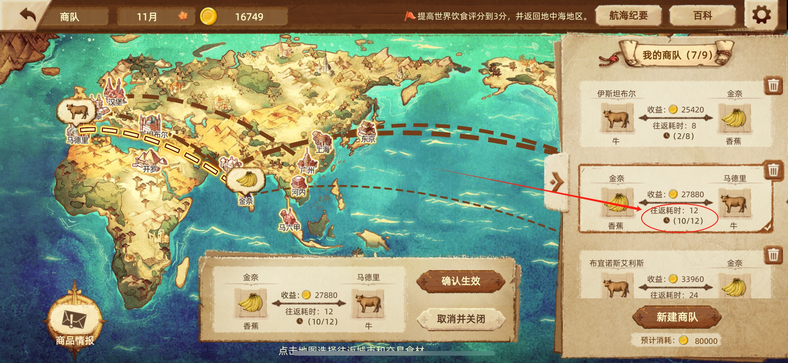 最后就只需等待运输了,商队下方会显示往返时间,左边是新建时的起点,若我们选择要运往上海的城市作为起点,那么等待时间只需一半。