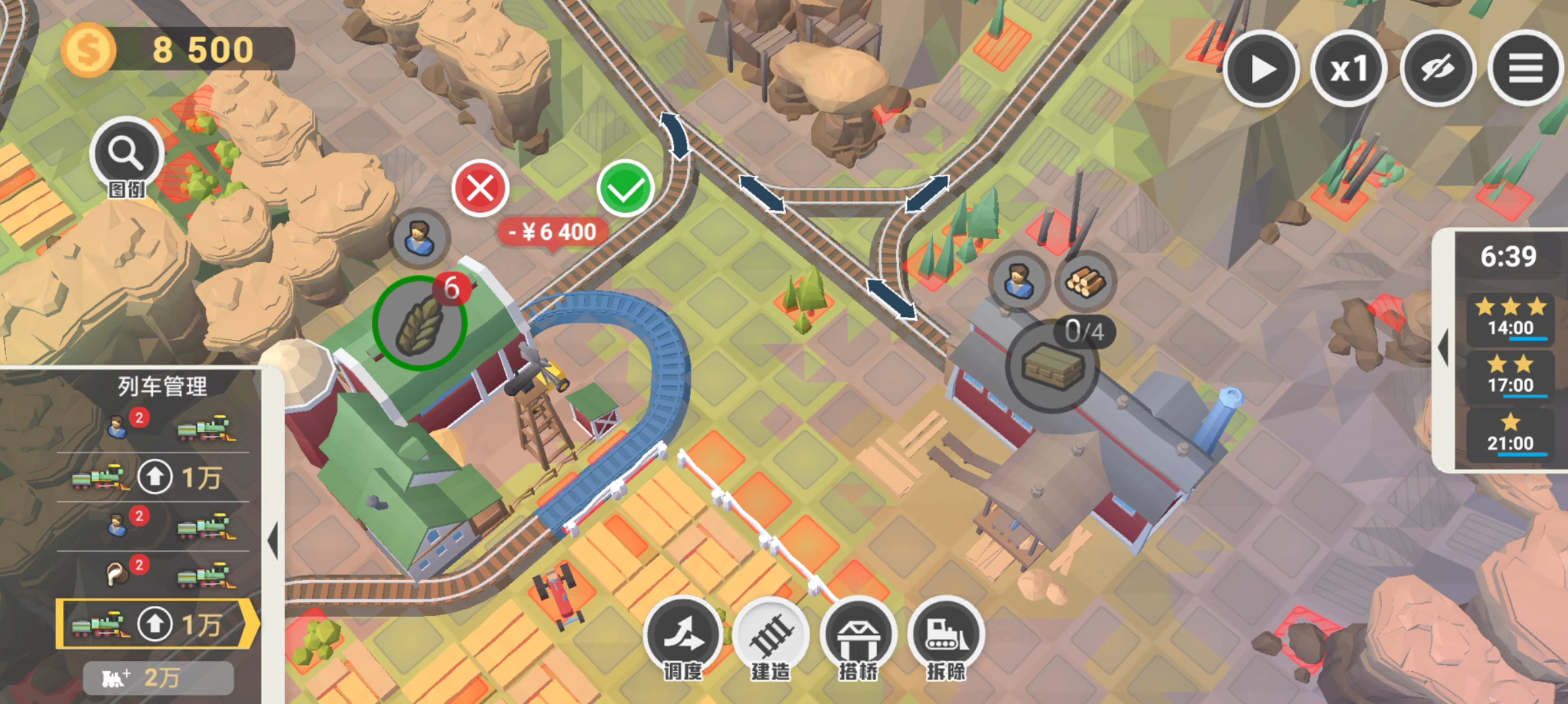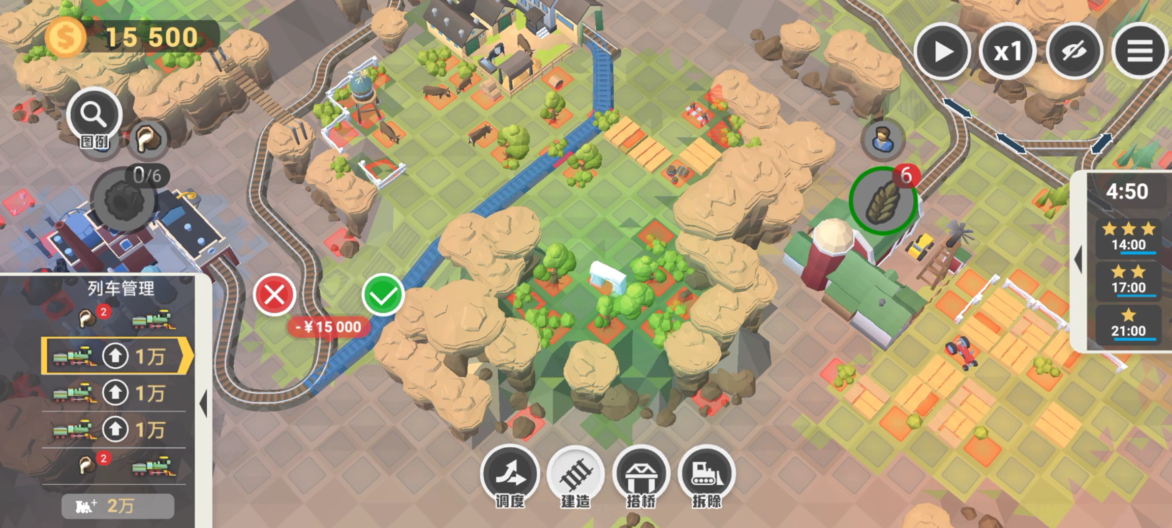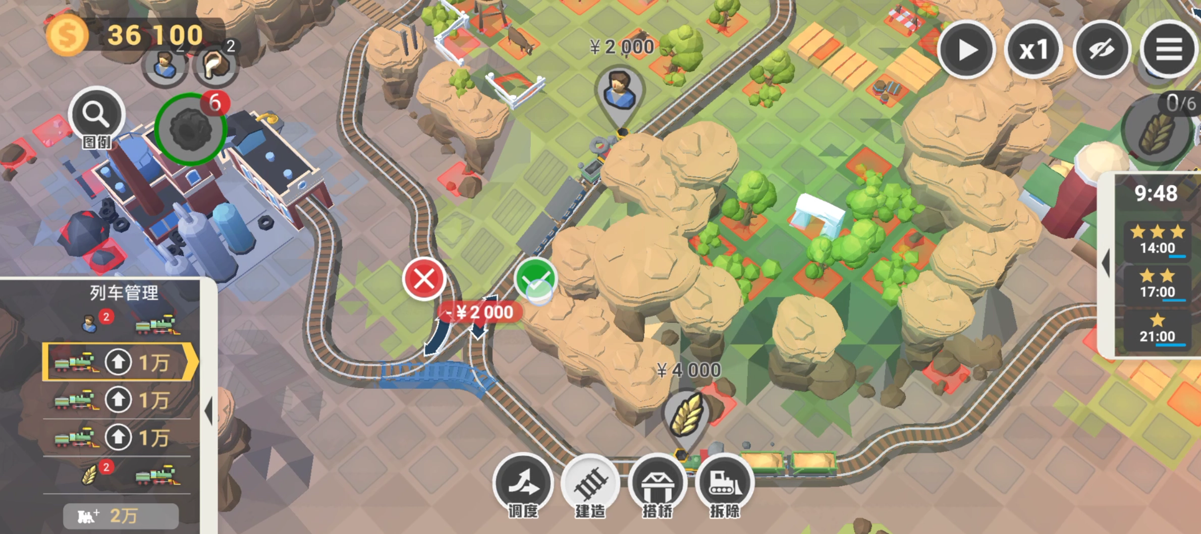 满分条件:14:00内,不要建造桥梁,不用升级火车头。