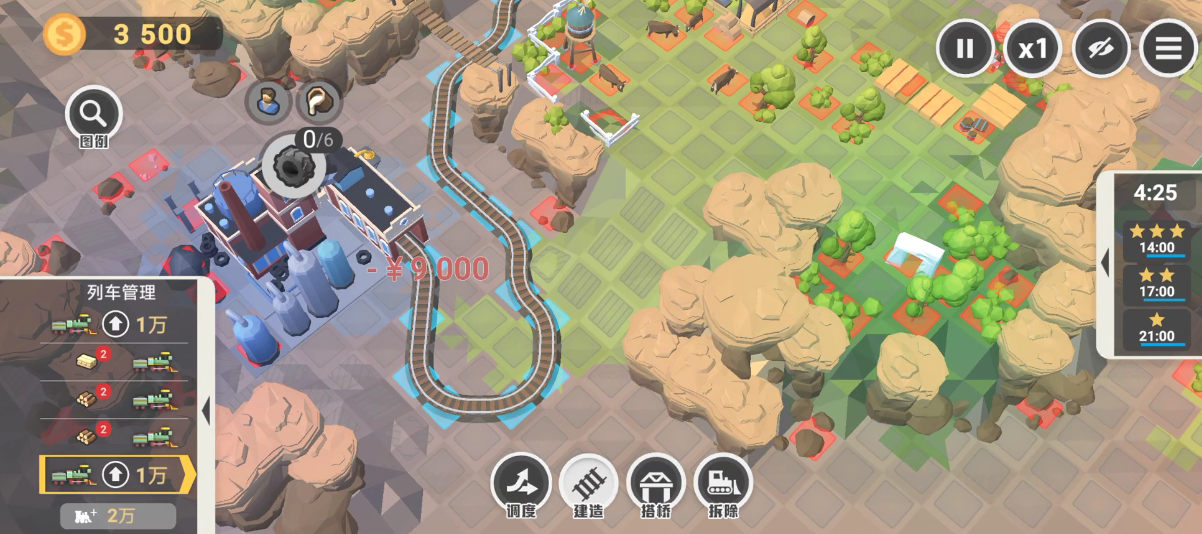 流程:1. 此关卡全程都需手动铺设铁路,原因在于诸多地方没有桥梁,无法绕路通过,而且自动铺设的路线会很偏离。第一步先铺设通往右侧木板厂的铁路,注意不要直接前往伐木场,同时要派遣工人。
