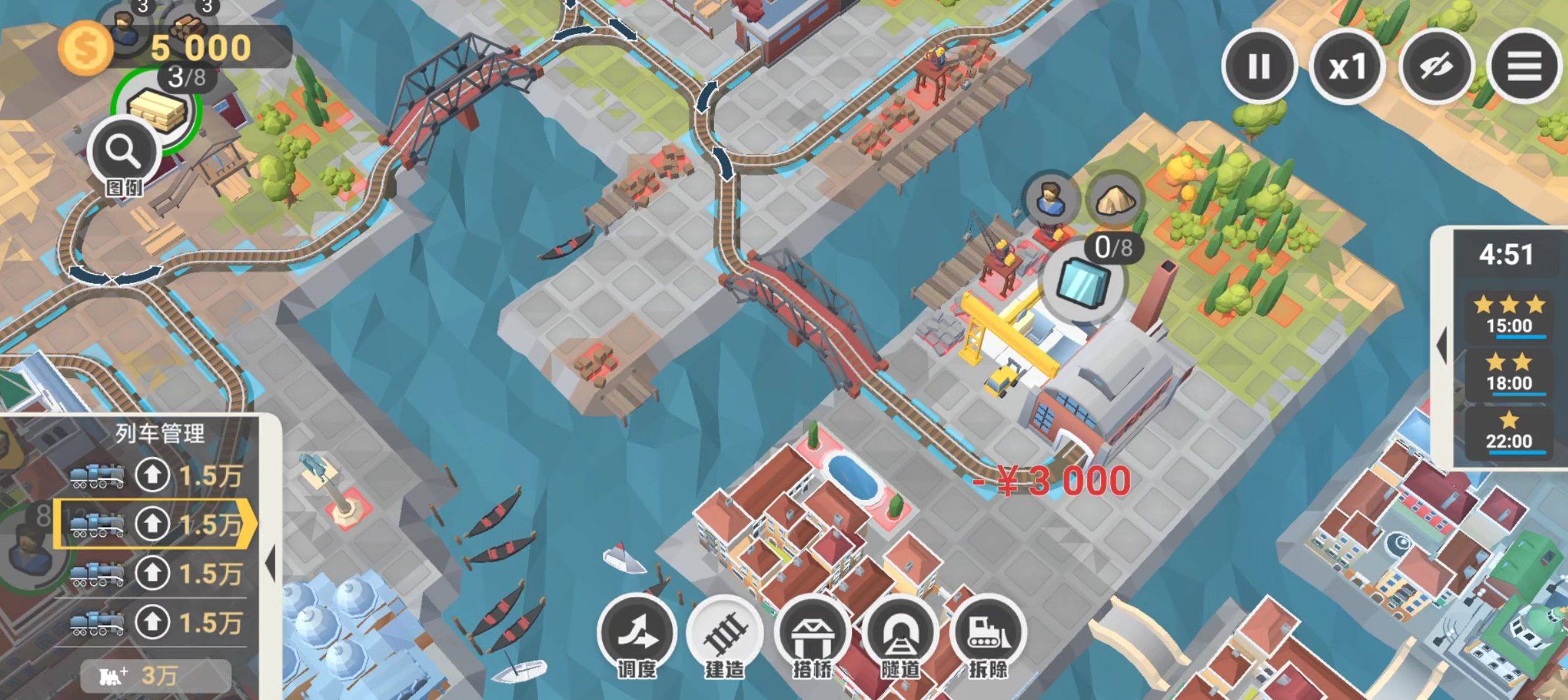 铁路规划新星第十一关该怎么通关呢?第十一关威尼斯的满分条件为:在15:00之内完成,过程中要避免碰撞,轨道铺片数量不能超过70片。物资需求方面,左侧城镇需要6个木板和8个椅子,右侧城镇需要9个玻璃。这次为大家带来“boyue游戏达人”的《铁路:规划新星》第11关满分详尽攻略。