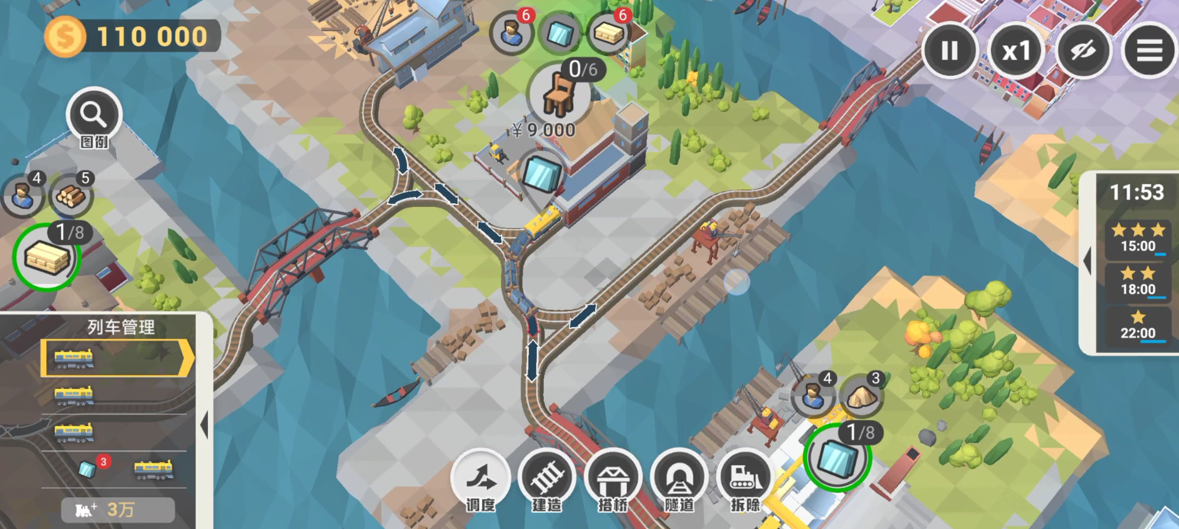 3. 分别铺设从伐木场到木板厂的铁路,以及从左侧城镇到木板厂的铁路。从左侧城镇调配工人,先安排8人,等木材运抵后,再从中选派6人前往木板厂,此后便无需再向木板厂派遣工人。