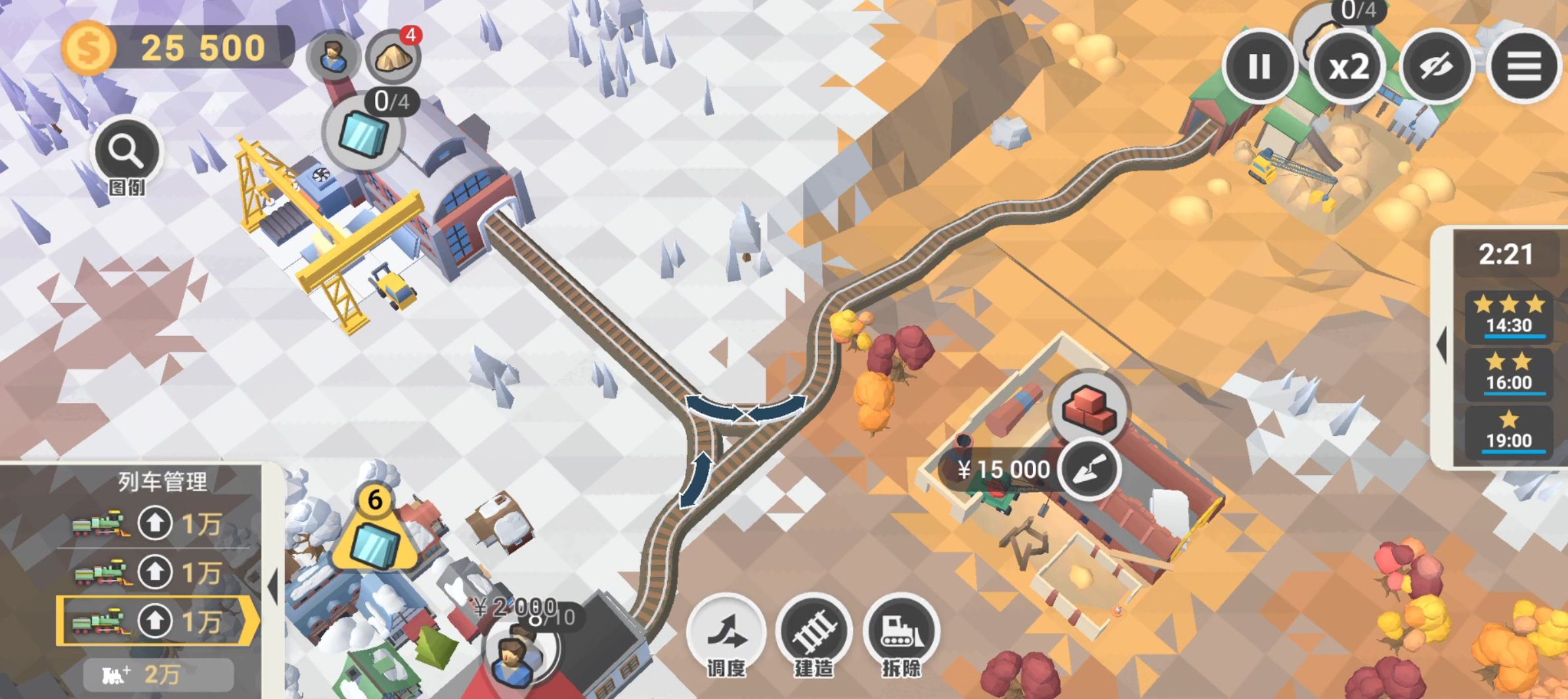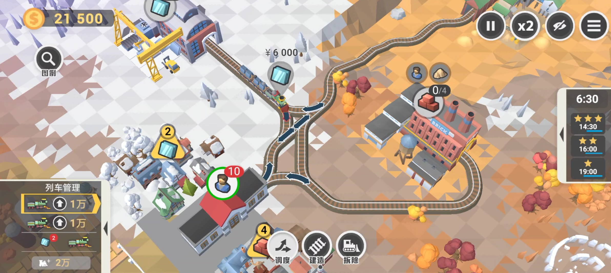 ——此时玻璃需求已达成,将砂石运往砖头厂。当火车驶入右侧铁路时,安排工厂前往砂石厂——待最后这批砖头需求完成就可以了。
