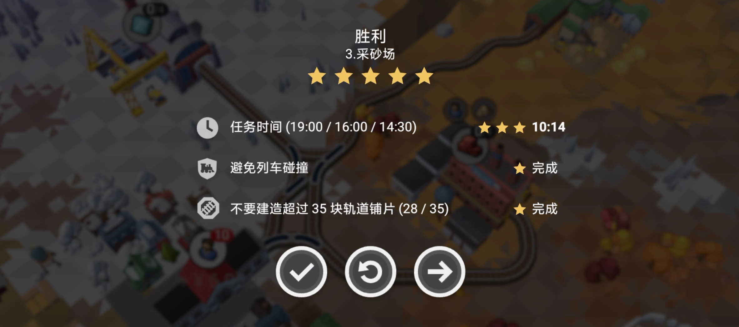在《铁路规划新星》游戏里,第三关场景为采砂场。想要拿到满分,需满足以下条件:在14分30秒内完成,过程中要避免列车发生碰撞,并且使用的铁道轨片不能超过35片。此外,这一关的物资需求是4个砖头和6个玻璃。今天,“boyue游戏达人”为大家带来《铁路:规划新星》第3关的满分详细攻略,让我们一起来瞧瞧吧!