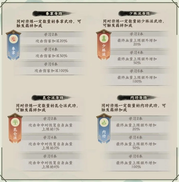 搭配原理:前期的羁绊属性主要集中于少林派提升血量上限以及昆仑派按百分比回血,以此确保自身血线的稳定。与此同时,借助拳掌攻击伤害加深的特性来进行输出。到了中期,获取蓝色神通“神龙素女功”后,优先将其提升至3星,此时流派便宣告大成。本阵容凭借少林派与内功所带来的高额血量上限,加上“3星内功”能使所有已学习的同门派武功星级 +1 的效果,从而取得胜利。