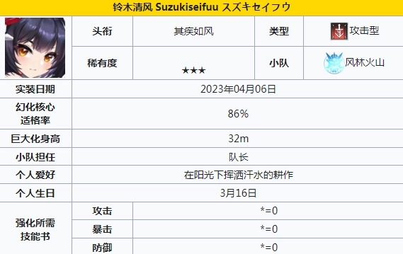 铃木清风:普通攻击后,能对敌方目标造成相应比例的伤害。战斗开始时,还可提升输出能力,并永久获得自身机动力。