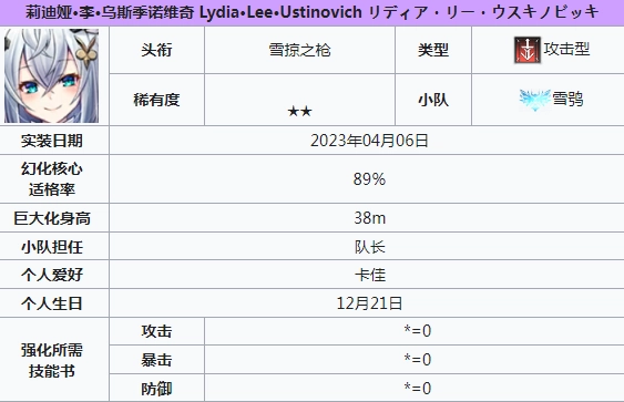 莉迪娅·李·乌斯季诺维奇是一名攻击型角色。完成普通攻击后,其远点射击能对目标造成90%攻击力的伤害。永劫子弹在发动攻击前,可使自身攻击力提升20%,且该效果持续18个回合。此角色尤其擅长在雪地作战,于战场上,不仅具备强大的火力输出,还能冷静分析各类情报。