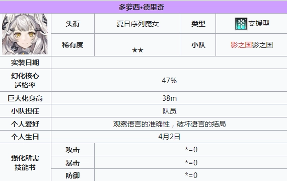 多萝西·德里奇是一个支援型角色,她个人爱好观察语言的准确性以及破坏语言的结局。从角色设定而言,她较为擅长运用语言类技能,借此完成资源获取,既能干扰敌人,又能为队友带来更多辅助效果。