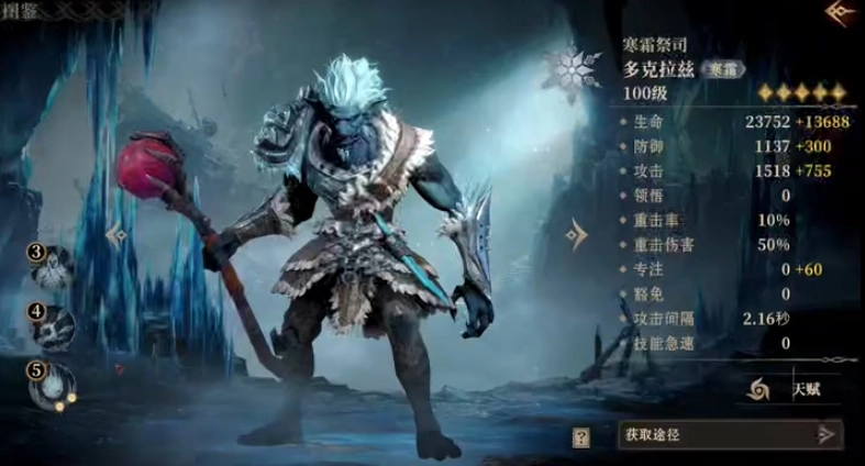 先来说说史诗英雄多克拉兹,他的被动技能独具特色且十分实用。普通攻击有60%几率触发追加伤害,还会给目标施加持续5秒的寒霜效果。要特别留意,该技能攻击时会优先挑选未处于寒霜状态的目标。多克拉兹的战技同样强大,能对范围内敌人造成280%的冷冻输出伤害,同时有75%几率施加寒霜效果。使用战技后,自身还能增加25%的威能。而他的威能技威力更是惊人,会向目标区域投掷冰球,对范围内敌人造成520%的冷冻伤害。要是这一招对处于寒霜状态的敌人造成了输出伤害,自身就会获得15%的攻击加成效果,且该效果能持续10秒。