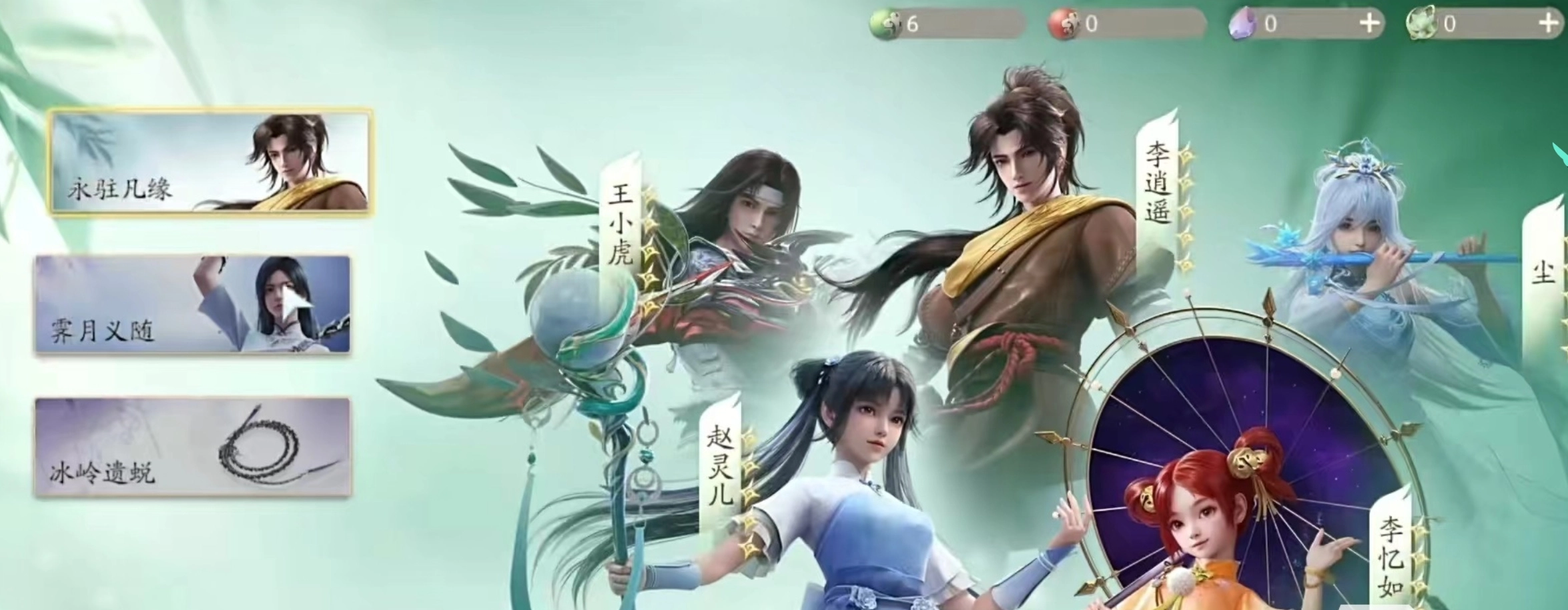 首套阵容为:赵灵儿、李忆如、尘、李逍遥。赵灵儿身为水系辅助,能为队友增加伤害并进行治疗。尘在该队伍里可充当副C,通过召唤攻击来实现输出,而且能与赵灵儿协同作战输出。李逍遥属于雷系角色,主要打出高爆发伤害,可担任主C,与此同时,还能和赵灵儿触发雷电元素反应,进而打出额外伤害。李忆如同样是水属性辅助,能够大幅度恢复生命值。