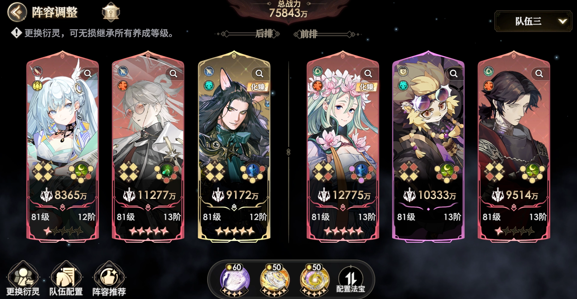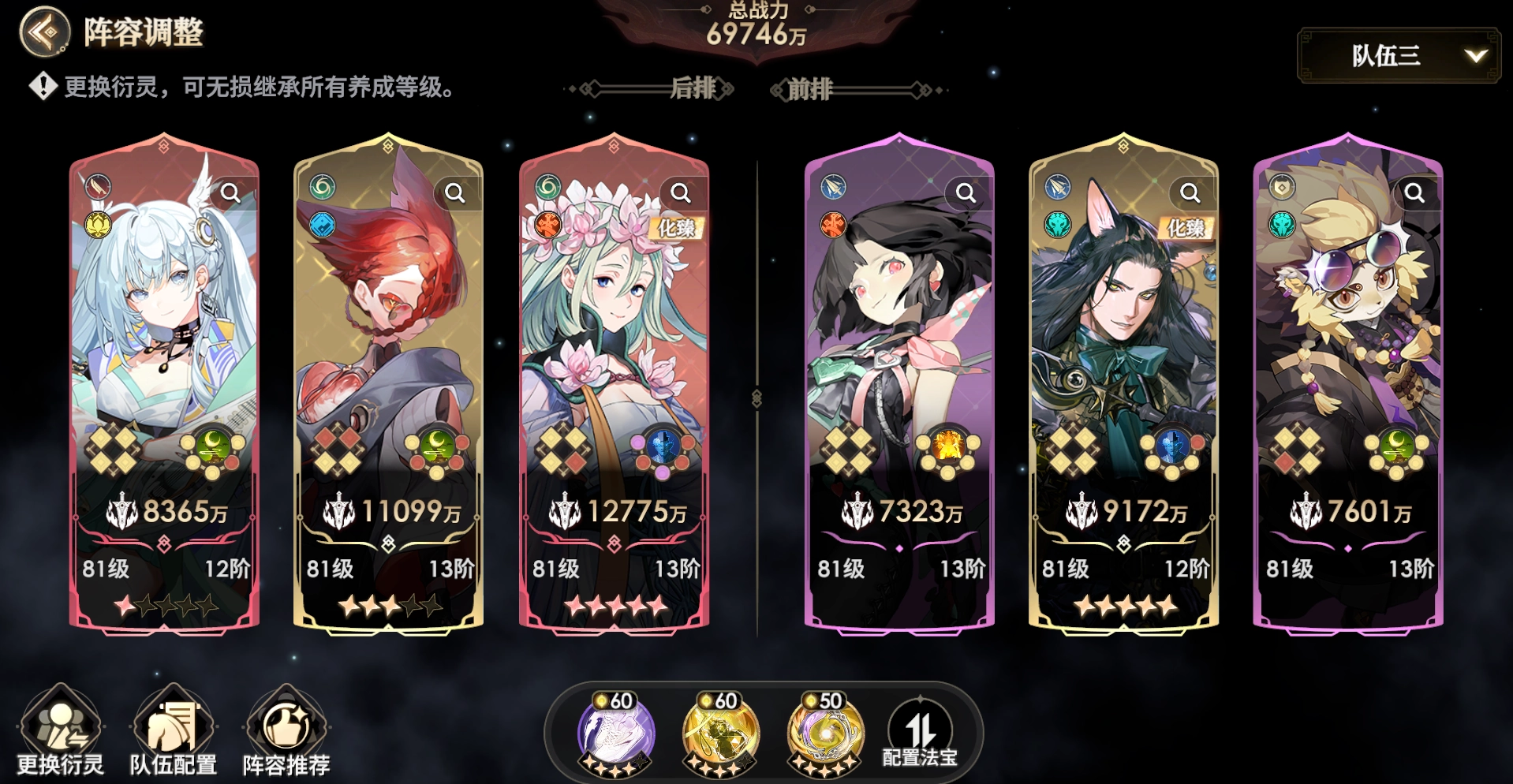 2. 上阵6人选择奎木狼、百花羞、李白、杜甫、黄狮精与妙音鸟,连携全部开启。灵韵推荐如下:奎木狼选“凡心难却”,百花羞选“凡心难却”,李白选“法天象地”,杜甫选“梭罗仙木”,黄狮精选“梭罗仙木”,妙音鸟选“梭罗仙木” 。 配队思路:此阵容着重于对敌方后排进行爆发输出,可快速击杀敌方后排,使其减员,进而形成我方人多、敌方人少的局面,像滚雪球般逐步碾压对手。该配队思路与之前的基本相同,只是攻击目标从敌方前排变为了后排。原因在于,相较于坚实的前排,后排较为脆弱,更易达成“滚雪球”的效果。而且,这套阵容的前排坦度比之前那套更高,输出集中在后排,能有效避免我方角色突然死亡,容错率也随之提高。