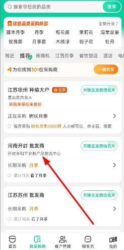 2. 来到采购商页面,这里呈现推荐、新商机、餐饮饭店、酒店等内容,用户能够通过搜索来查找采购商。