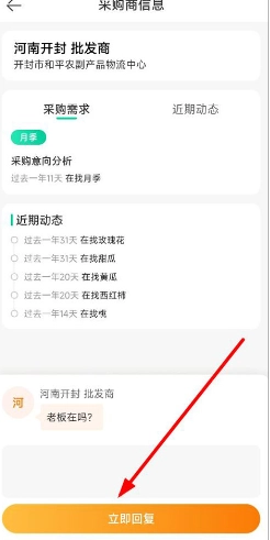3、当用户点击采购商后,能够查看采购商的采购需求、意向以及近期动态等信息。若想与采购商沟通,点击“立即回复”即可。