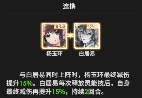 当与白居易一同出战时,杨玉环的最终减伤会提升15%。而白居易每次施展灵能技之后,自身的最终减伤会额外再提升15%,此效果持续2回合。