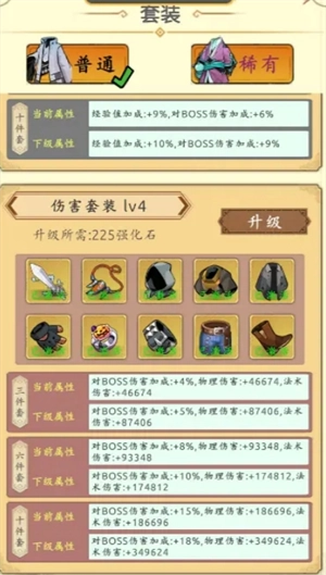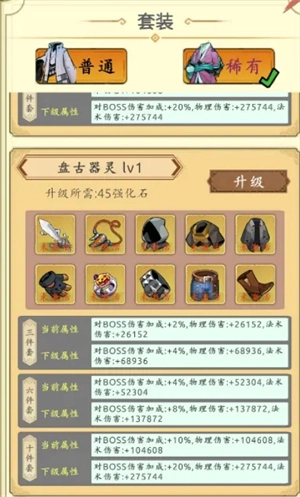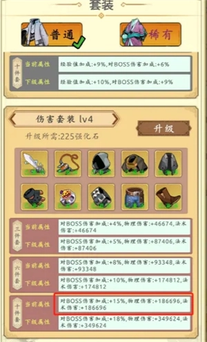 我们以3件套为参考,1级升2级消耗45个石头,刚好是普通套2级升3级的消耗,而每一级的增幅是2.64倍,那么3级的就是18.1万伤害,对应的4级普通套