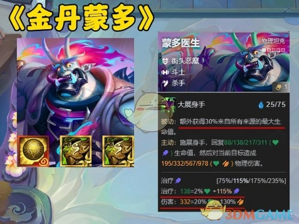 3、详细剖析:蒙多拥有一项被动技能,能额外获取30%的生命值,而且其主动技能同样与生命值加成存在关联。