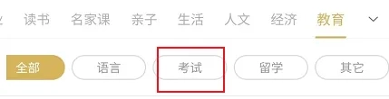 4、进入“全部精品”板块,找到“教育”分类,点击“考试”选项。