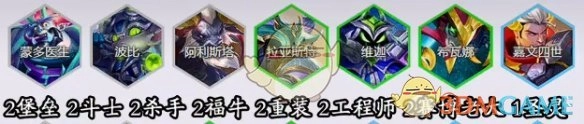 2、羁绊:包含2堡垒、2斗士、2杀手、2福牛、2重装、2工程师、2赛博老大以及2圣灵