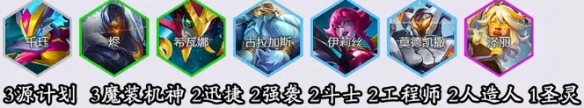 2、羁绊配置:3个源计划成员、3个魔装机神成员、2个迅捷角色、2个强袭角色、2个斗士角色、2个工程师角色、2个人造人角色以及1个圣灵角色所构成的羁绊