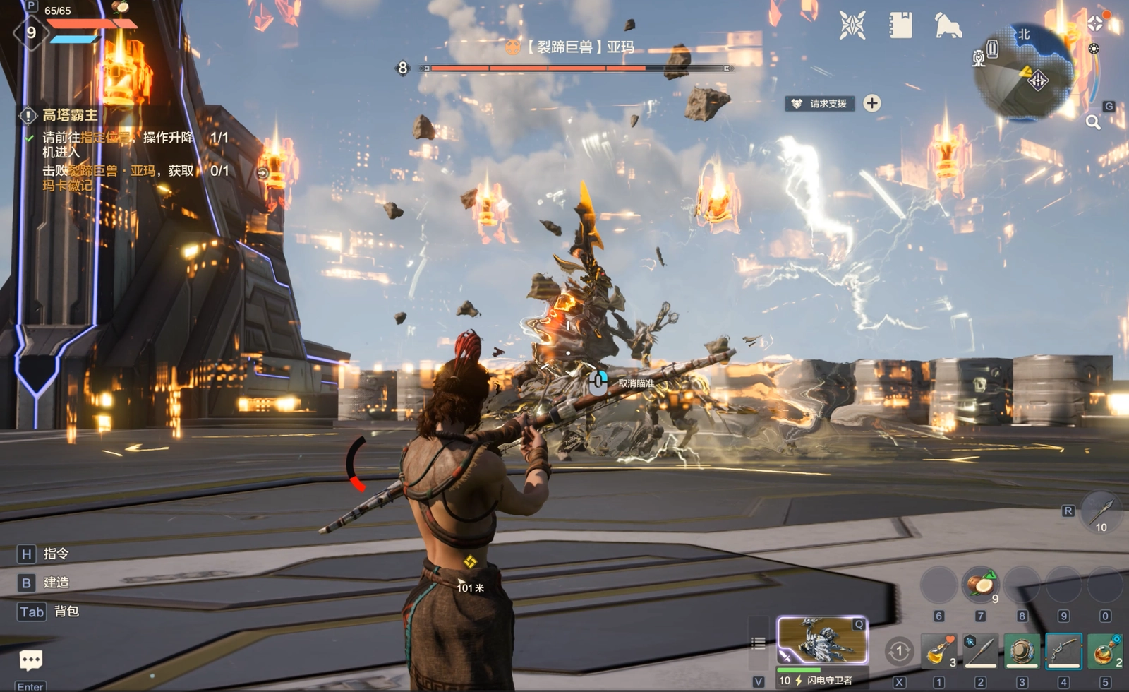 裂蹄巨兽亚玛在裂蹄原野的高塔上,前期可以直接利用坐骑快速到达位置,点机关按钮,然后直接坐升降机上去即可。