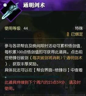 通明剑术是《逆水寒》中的一款限时道具。想知道如何获取该道具吗?参与帮会活动,或者参加晚间限时活动,就能获取【个人悟剑值】。当【悟剑值】累积至100点,便可得到【通明剑术】。接下来,就让小编为大家详细介绍通明剑术的获取攻略,希望能对各位有所帮助。