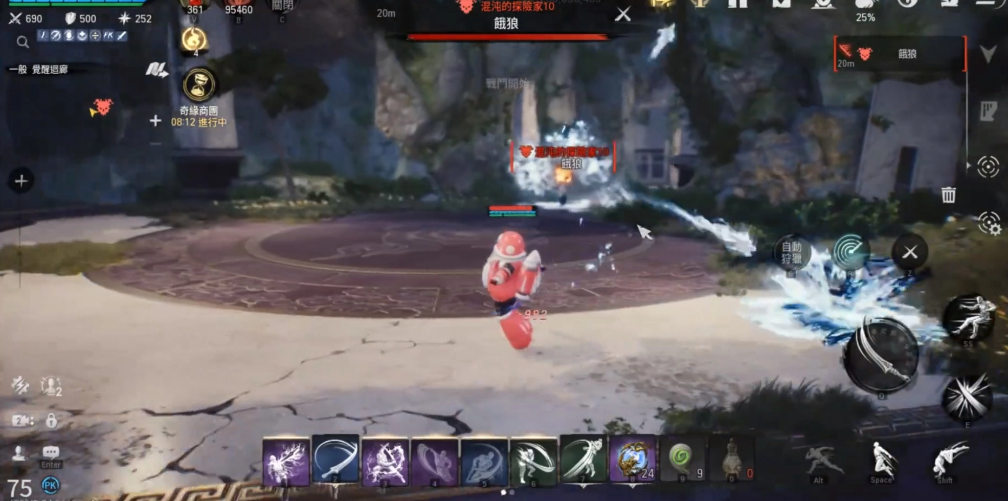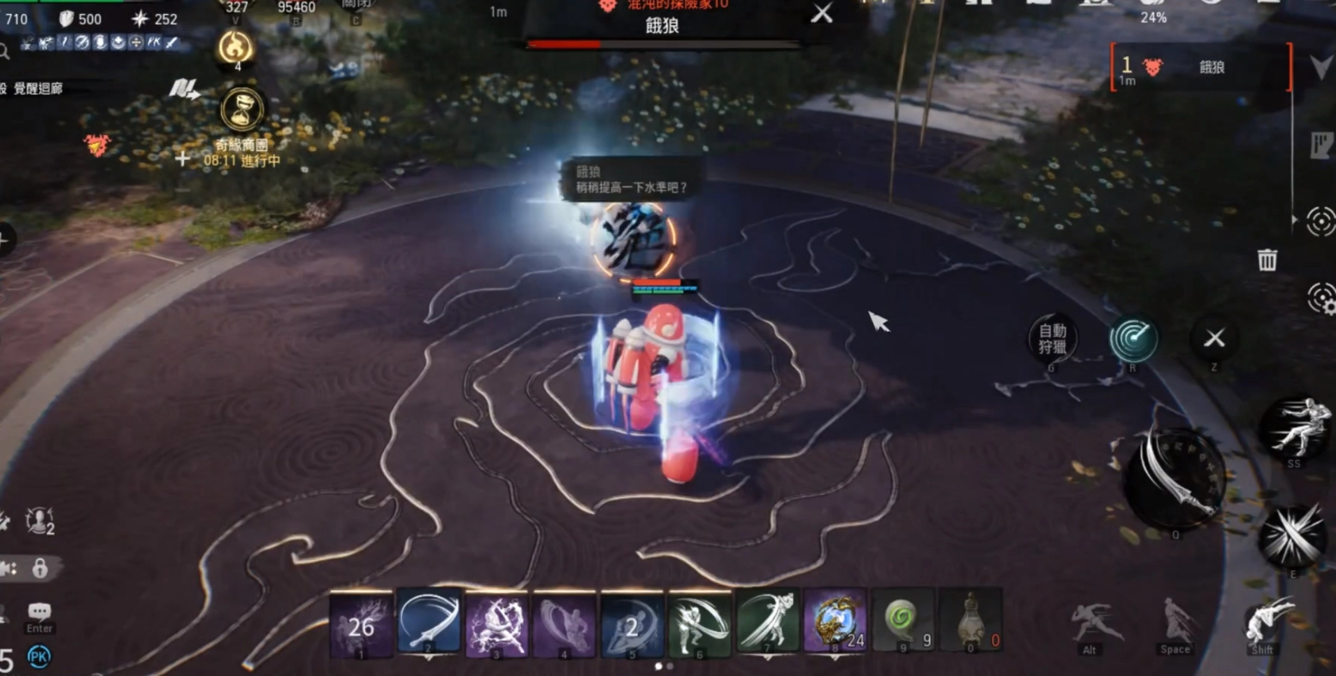 当大家滑翔至试炼台的那一刻,便会吸引饿狼的仇恨。此时,切勿急于上前,因为饿狼有两个起手招式需要先躲避。其一,它会朝着玩家所在方向发射几道笔直的冰霜剑气,对此,只需保持横向移动就能躲开。其二,它会发射数次具有追踪效果的剑气,面对这一招,要尽量与它拉开距离并绕圈跑动。原因在于,第二个技能的伤害是范围性的,即便躲开了爆炸点,要是没有远离技能范围,依旧很容易受到伤害。