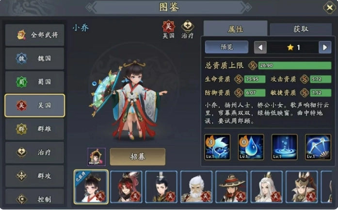 在加点方面,强烈建议大家采用全部加武力的方式。要知道,太史慈身为输出型武将,攻击力对他而言至关重要,堪称生命线。说到阵容搭配,个人觉得选择小乔、甘宁、黄盖以及周瑜作为太史慈的队友,那是再恰当不过了。先讲讲小乔,她在吴国阵容里主要承担治疗职责。小乔的必杀技可以在关键时候为己方随机三个目标进行治疗,让队友们快速恢复生命值。并且在释放必杀技之后,小乔自身还会进入防御提升的状态。