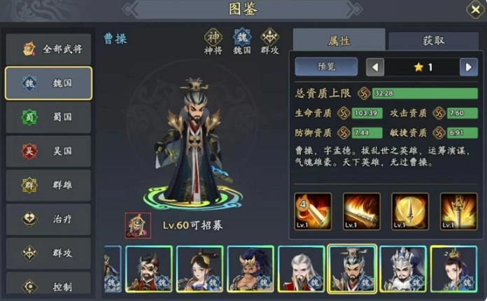与此同时,他不仅能够对多个目标造成伤害,还能施加其他附加状态。当辅助武将郭嘉与司马懿一同出场时,能全方位增强己方队伍。在输出方面,曹操与张辽的组合也颇为出色。曹操作为群攻型输出武将,其必杀技可对敌方全体目标造成巨额伤害。曹操的必杀技在造成伤害之际,还能恢复自身生命值。并且在被动技能的加成下,曹操造成伤害时,还有一定几率为目标施加威压状态,从而降低对方的敏捷。