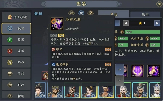 甄姬在游戏中身为神将一员,有着额外的资质加成,自然也就成为了众多玩家手中的备选武将,作为输出型武将,甄姬的主要伤害输出源泉来自于她那两个独具特色的主动技能,先来说说第一个主动技能,它属于远程单体攻击类型,当甄姬施展此技能时,便能在敌方单个目标身上巧妙地施加一枚神秘印记,与此同时,自身会获得令人称羡的凌波微步状态。