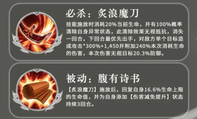 而吕蒙的大招则是会消耗自己部分生命数值,技能施放时消耗20%当前生命,并有100%概率清除自身异常状态,此清除效果无视抵抗,消失一回合,下回合最优先出手,对敌方单个目标造成攻击*300%+1,450并附加240%本次消耗生命的伤害,本次伤害无视目标20.3%防御,鉴于大招在团战中的重要作用以及其强大的输出和控制能力,玩家在技能加点时应优先将其提升到较高等级。
