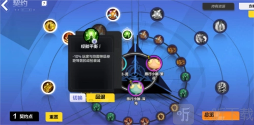 当你在各个区域的内环点亮2个技能后,便可随意点亮该区域的一个中环技能。而当点亮该区域3个中环技能时,就能点亮该区域最外环的技能。也就是说,一个区域要完全点满需10点契约点数。当前升级仅能获取24点契约点,那剩下的6点契约点从何处获取呢?此时就该契灵发挥作用了。