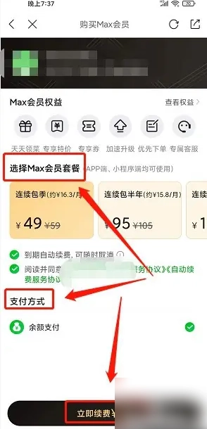 4、进入购买MAX会员界面,选择Max会员套餐、支付方式,点击"立即续费",如图所示
