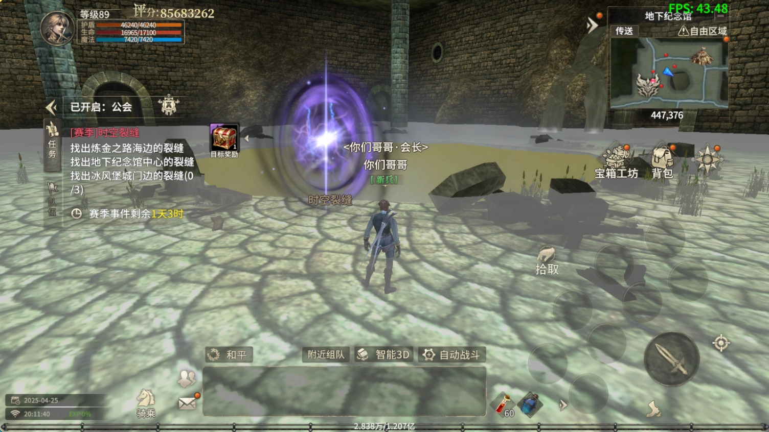 地下纪念馆中心的裂缝位置为447,376附近,找到裂缝开启时空裂缝副本,进入并清理怪物即可完成修复。